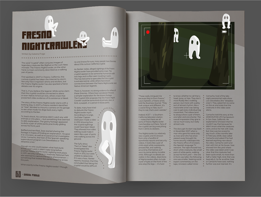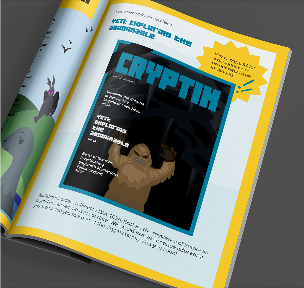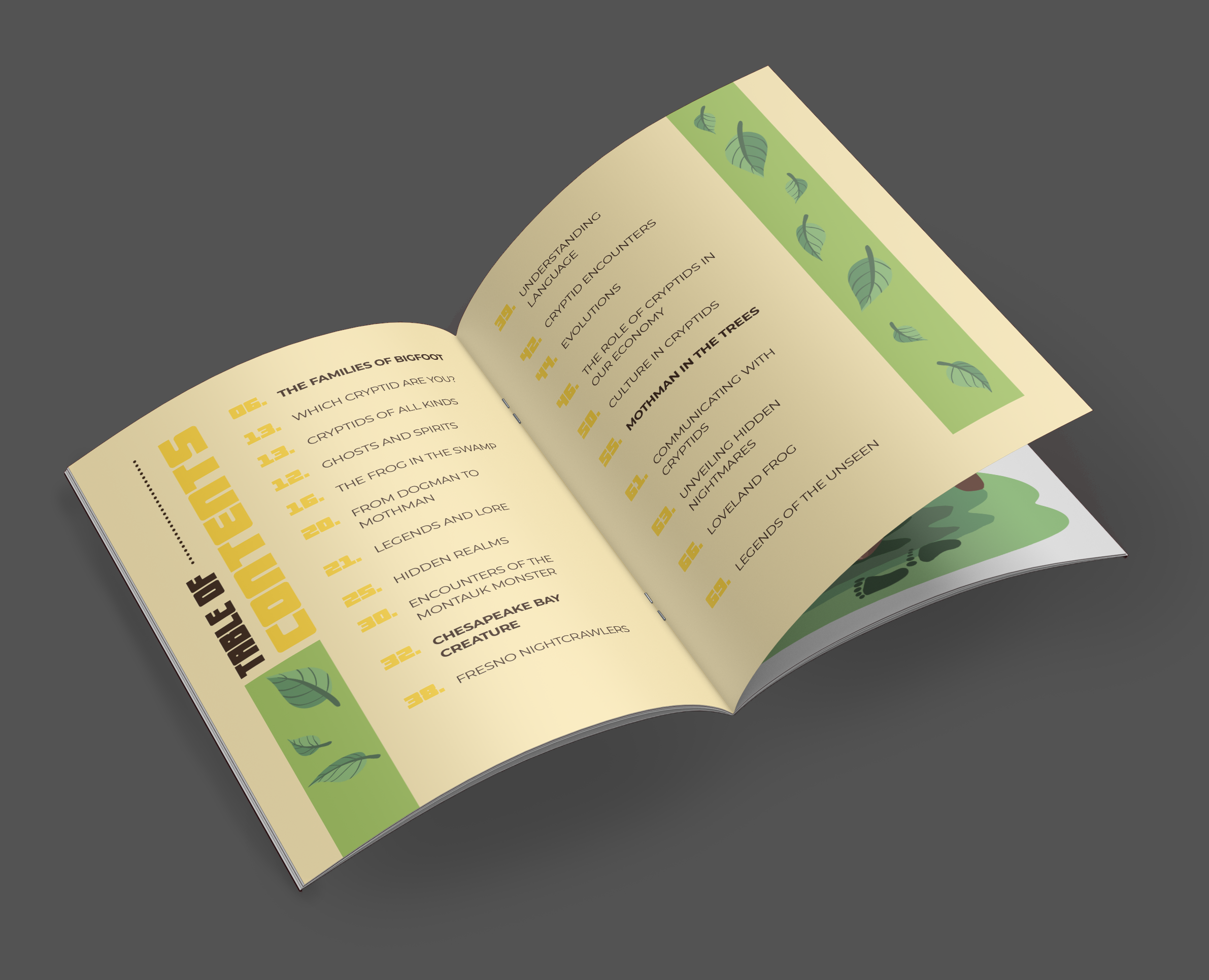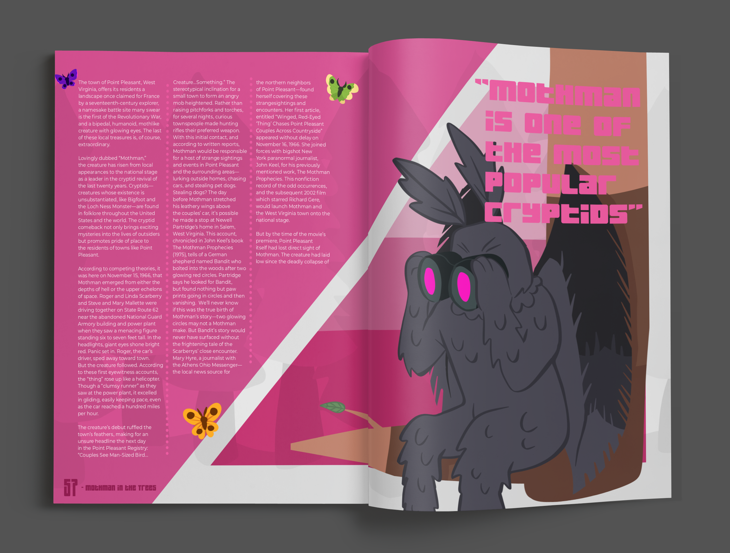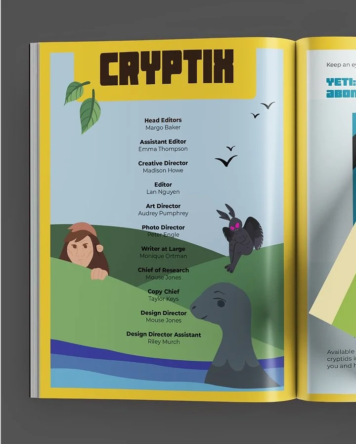 A magazine about different cryptids across the United States. The project uses a flat vector style with cell shading and a mix of spot and full page illustrations.