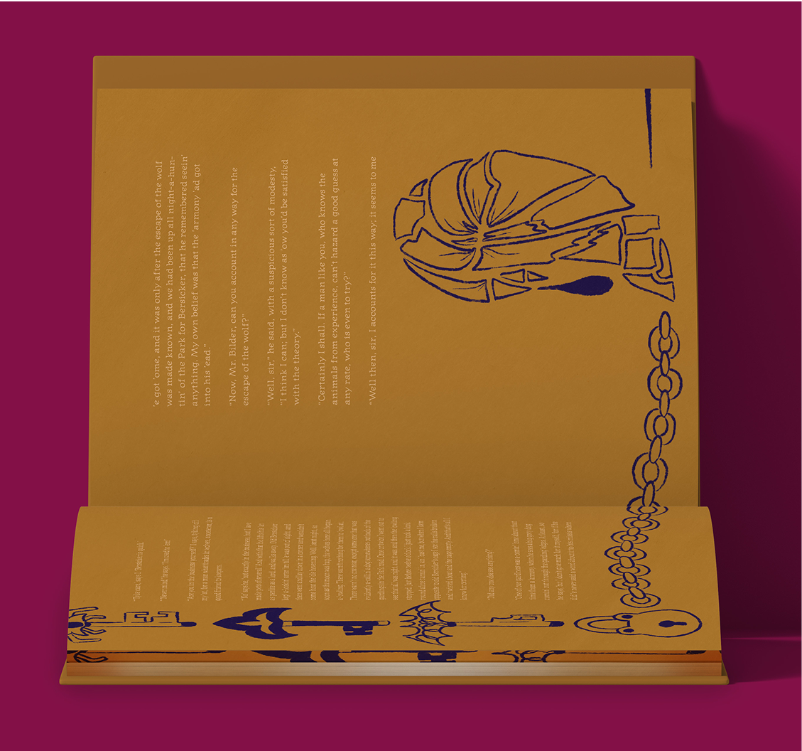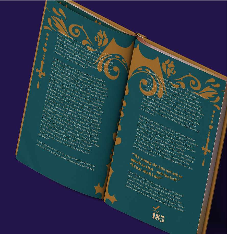 This is a redesign of the classic novel with the adjectives elegant, timeless, gothic, and playful. The design also showcases border illustrations and uses icons from the borders throughout the spreads.